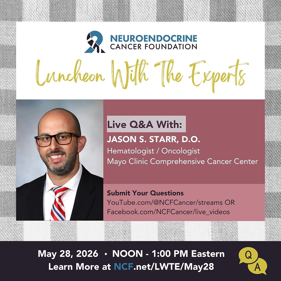 āLuncheon With The Expertsā is a recurring educational outreach seriesĀ (previously hosted by the Carcinoid Cancer Foundation) aimed at patients, caregivers, and the broader neuroendocrine cancer community. The sessions are hosted by Rain Bennett.